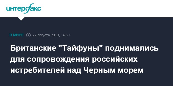 Москва. 22 августа. INTERFAX.RU - Два истребителя "Тайфун" Королевских ВВС Великобритании вылетали с базы "Михаил Когалничан" для сопровождения двух российских многоцелевых истребителей Су-30 над акваторией Черного моря, сообщает в среду британская газета Daily Express, которая приводит выдержки из сообщения британских ВВС.