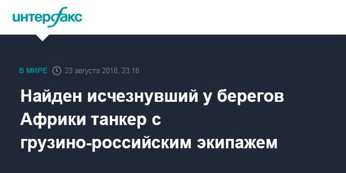 Москва. 23 августа. INTERFAX.RU - Пропавший на прошлой неделе у берегов западной Африки танкер под панамским флагом "Пантелена", на борту которого находятся 17 грузинских и двое российских моряков, обнаружен и доставлен в порт Овендо (Габон), сообщают в четверг вечером грузинские СМИ. По информации СМИ, об обнаружении судна сообщает Региональный центр морской безопасности Центральной Африки.