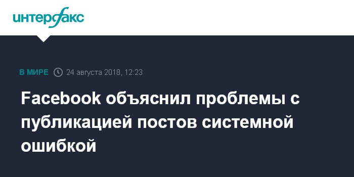 Москва. 24 августа. INTERFAX.RU - Причиной сбоя Facebook, из-за которого невозможно было сделать публикацию, стала ошибка в автоматизированных системах соцсети, заявили "Интерфаксу" в пресс-службе Facebook в России.