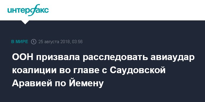 Москва. 25 августа. INTERFAX.RU - Организация объединенных наций (ООН) призывает арабскую коалицию во главе с Саудовской Аравией прекратить авиаудары по Йемену, в результате которых гибнет гражданское население, сообщает в пятницу агентство Associated Press.