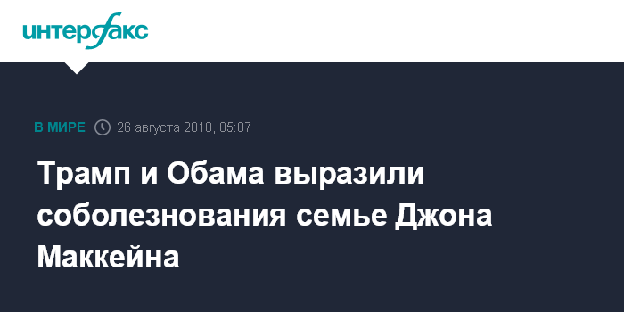 Москва. 26 августа. INTERFAX.RU - Президент Дональд Трамп выразил соболезнования близким сенатора Джона Маккейна, ушедшего из жизни на 82 году.