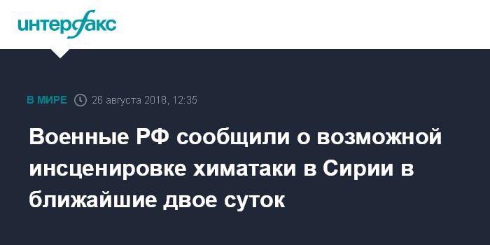 Москва. 26 августа. INTERFAX.RU - В Сирию на юг зоны деэскалаиции Идлиб прибыли англоязычные специалисты для инсценировки химической атаки против гражданского населения, сообщил в воскресенье официальный представитель Минобороны России генерал-майор Игорь Конашенков.