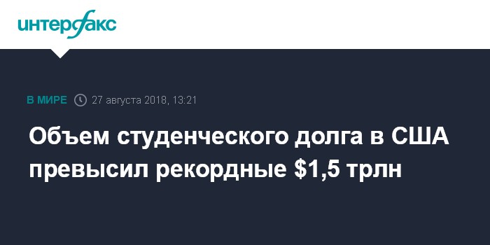 Москва. 27 августа. INTERFAX.RU - Объем студенческих займов в США превысил рекордную отметку в $1,5 трлн, несмотря на то, что фактические объемы кредитования в этой категории снижаются в течение последних нескольких лет.