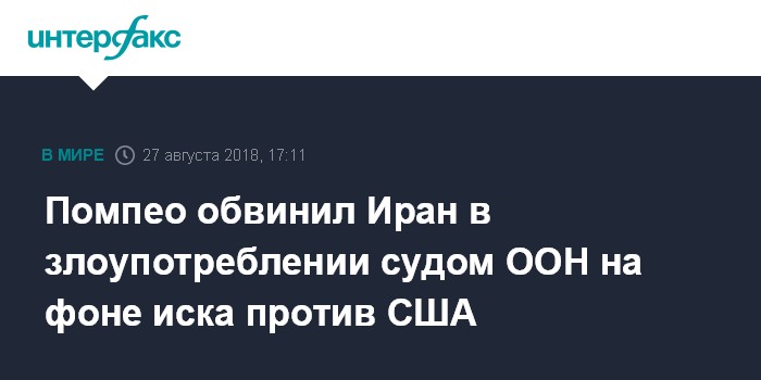 Москва. 27 августа. INTERFAX.RU - Власти Ирана, направившие в Международный суд ООН (ICJ) иск против США в связи с восстановлением американских санкций, используют суд в корыстных целях, говорится в заявлении госсекретаря США Майка Помпео.