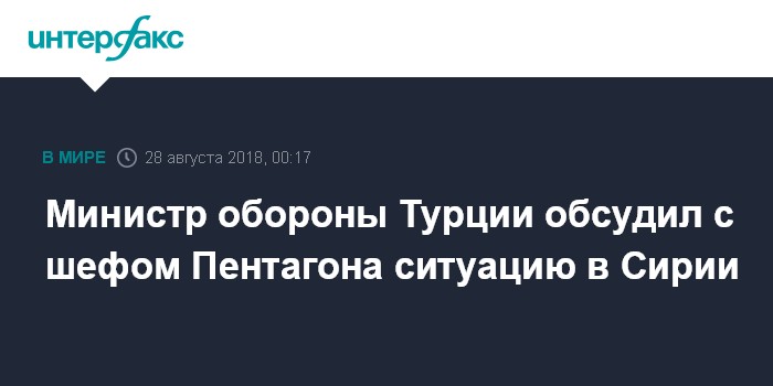 Москва. 28 августа. INTERFAX.RU - Министр обороны Турции Хулуси Акар и глава Пентагона Джеймс Мэттис провели в понедельник телефонный разговор, в ходе которого обменялись мнениями по ряду тем, сообщает интернет-портал турецкого издания "Сабах".