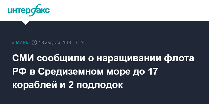 Москва. 28 августа. INTERFAX.RU - Россия на фоне угрозы США нанести удар по Сирии нарастила свою военно-морскую группировку в Восточном Средиземноморье, доведя общее количество боевых кораблей до 19 единиц. Об этом сообщила во вторник газета Haaretz, ссылаясь на данные наблюдателей на Босфоре.