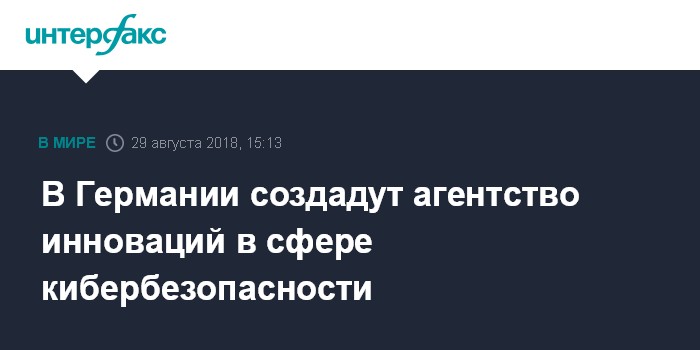Москва. 29 августа. INTERFAX.RU - Правительство Германии решило сформировать агентство инноваций в сфере кибербезопасности. Об этом сообщила официальный представитель кабмина Ульрике Деммер. Агентство будет подчиняться МВД и минобороны.