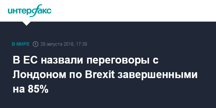 Москва. 29 августа. INTERFAX.RU - Переговоры с Великобританией о выходе страны из Евросоюза завершены на 85%, заявил в среду координатор ЕС по Brexit Мишель Барнье.