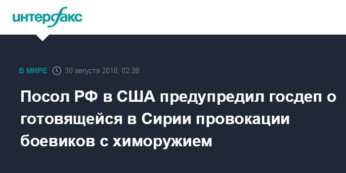 Москва. 30 августа. INTERFAX.RU - Посол РФ в США Анатолий Антонов в ходе встречи со спецпредставителем США по Сирии Джеймсом Джеффри и и.о. замгоссекретаря по Ближнему Востоку Дэвидом Саттерфилдом сообщил о подготовке в сирийском Идлибе провокации боевиков с применением токсичных химикатов.