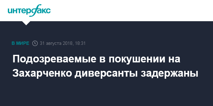 Москва. 31 августа. INTERFAX.RU - Правоохранители самопровозглашенной Донецкой народной республики задержали подозреваемых в покушении на главу ДНР Александра Захарченко, сообщил "Интерфаксу" источник в силовых структурах Донецка.