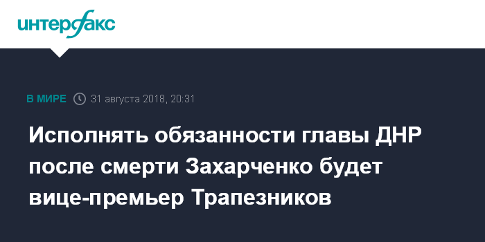 Москва. 31 августа. INTERFAX.RU - Временно исполняющим обязанности главы самопровозглашенной Донецкой народной республики после гибели Александра Захарченко станет первый вице-премьер Дмитрий Трапезников, заявил "Интерфаксу" депутат народного совета ДНР Владислав Бердичевский.