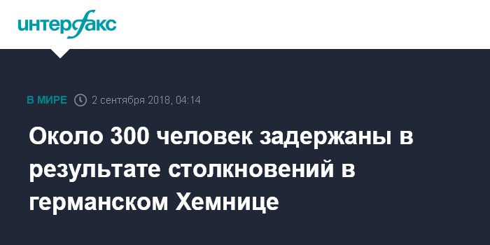 Москва. 2 сентября. INTERFAX.RU - В ходе демонстраций сторонников и противников миграционной политики канцлера Ангелы Меркель в городе Хемнице на юго-востоке Германии были задержаны около 300 человек, сообщила местная полиция.
