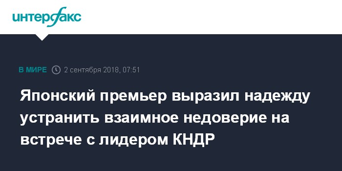 Москва. 2 сентября. INTERFAX.RU - Премьер-министр Японии Синдзо Абэ завил, что его возможная встреча с лидером КНДР будет способствовать устранению существующего взаимного недоверия между двумя странами.