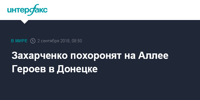Москва. 2 сентября. INTERFAX.RU - Глава самопровозглашенной Донецкой народной республики (ДНР) Александр Захарченко будет похоронен на Аллее Героев, сообщил депутат Госдумы Александр Ющенко, который приехал в Донецк, чтобы принять участие в церемонии прощания.