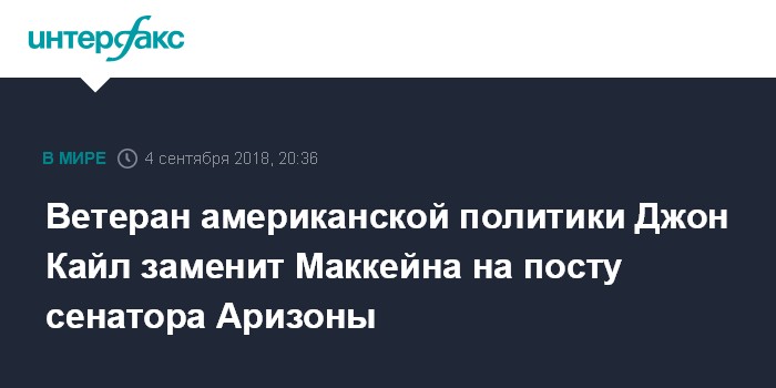Москва. 4 сентября. INTERFAX.RU - Губернатор Аризоны Даг Дьюси выбрал Джона Кайла в качестве сенатора штата Аризона, это место освободилось из-за кончины Джона Маккейна. Об этом сообщает газета The Wall Street Journal со ссылкой на пресс-секретаря губернатора.