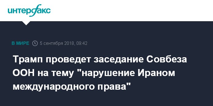 Москва. 5 сентября. INTERFAX.RU - Заседание Совбеза ООН под председательством президента США Дональда Трампа будет посвящено теме Ирана, в частности, данным о нарушении Ираном международного права, заявила во вторник постпред США при ООН Никки Хейли.