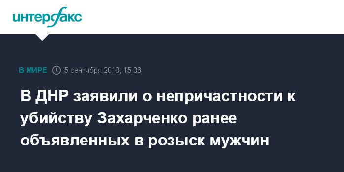 "Ранее на официальном ресурсе МВД ДНР была размещена информация о розыске лиц, находившихся 31 августа в кафе "Сепар" и, возможно, обладающих сведениями о деталях теракта, в результате которого погиб глава Донецкой народной республики Александр Захарченко. Министерство внутренних дел благодарит граждан за предоставленную информацию, причастность к инциденту лиц, чьи фотографии были размещены ранее, не подтверждена", - сказано в тексте сообщения.