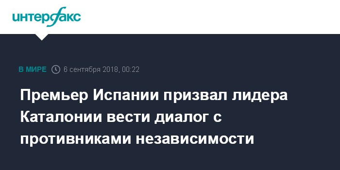 Москва. 6 сентября. INTERFAX.RU - Премьер-министр Испании Педро Санчес призвал главу женералитата (регионального правительства) Каталонии Кима Торру начать диалог с теми, кто выступает против независимости Каталонии, сообщила в среду газета El Pais.