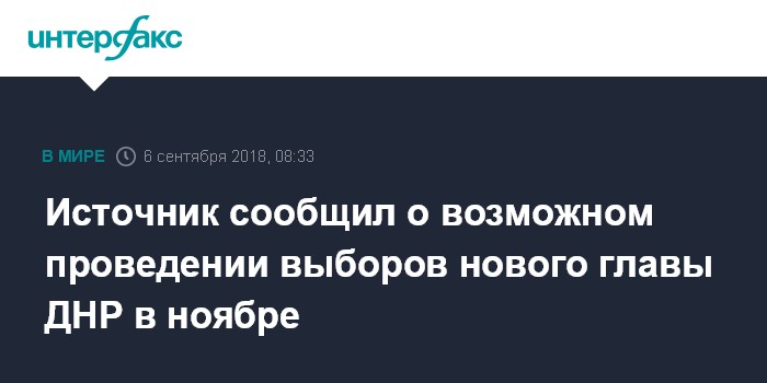 Москва. 6 сентября. INTERFAX.RU - Нового главу самопровозглашенной Донецкой народной республики (ДНР) могут избрать в начале ноября, сообщил "Интерфаксу" источник в аппарате исполняющего обязанности главы республики.