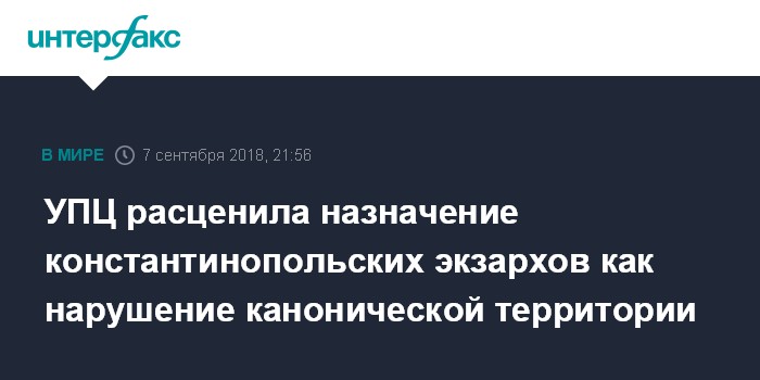 "По благословению Блаженнейшего митрополита Киевского и всея Украины Онуфрия Отдел внешних церковных связей Украинской православной церкви уполномочен заявить, что назначение экзархов является грубым нарушением канонической территории Украинской православной церкви", - говорится в распространённом в пятницу вечером заявлении ОВЦС УПЦ.