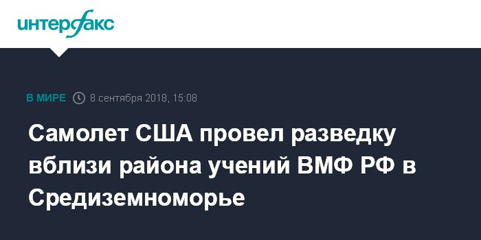 Москва. 8 сентября. INTERFAX.RU - Патрульный противолодочный самолет ВМС США P-8A Poseidon в субботу провел многочасовой разведывательный полет вблизи района проведения учений кораблей Военно-морского флота (ВМФ) России в Восточном Средиземноморье, следует из мониторинговых данных западных авиационных ресурсов.