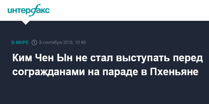 Москва. 9 сентября. INTERFAX.RU - Гонконг. 9 сентября. ИНТЕРФАКС - Лидер КНДР Ким Чен Ын посетил военный парад в Пхеньяне по случаю 70-й годовщины образования страны, однако не стал выступать перед согражданами, передает в воскресенье агентство "Ренхап".