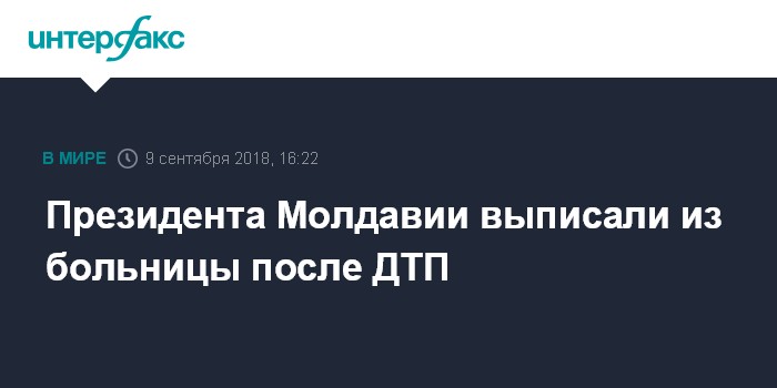 Москва. 9 сентября. INTERFAX.RU - Президент Молдавии Игорь Додон, пострадавший в дорожной аварии в воскресенье, был выписан из больницы после оказания первой медицинской помощи, сообщил журналистам врач больницы скорой помощи Кишинева Михай Чекан.