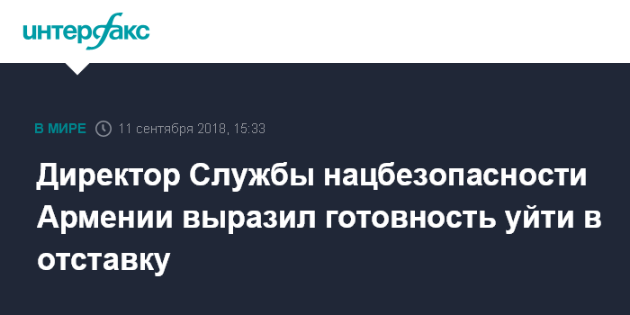 Москва. 11 сентября. INTERFAX.RU - Директор Службы национальной безопасности (СНБ) Армении Артур Ванецян готов уйти с поста после появления в сети скандальной аудиозаписи его телефонного разговора с председателем Специальной следственной службы (ССС) Сасуном Хачатряном о деле против экс-президента страны Роберта Кочаряна и нынешнего генсека ОДКБ Юрия Хачатурова.