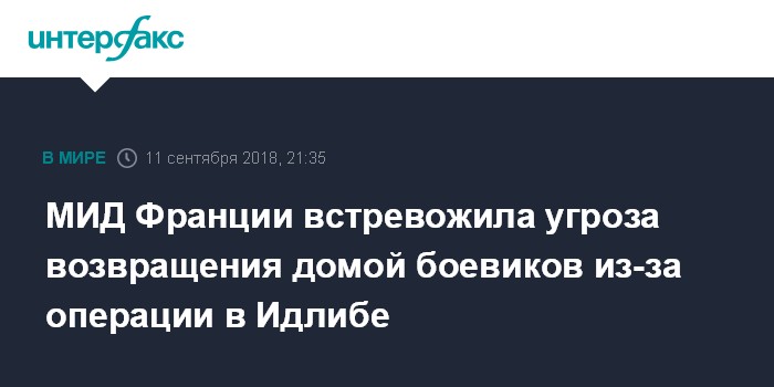 Москва. 11 сентября. INTERFAX.RU - Министр иностранных дел Франции Жан-Ив Ле Дриан во вторник заявил, что возможная военная операция в сирийской провинции Идлиб может привести к тому, что сражающиеся на стороне террористических группировок иностранные боевики станут возвращаться в свои родные страны.