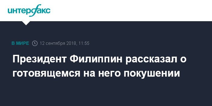 Москва. 12 сентября. INTERFAX.RU - Президент Филиппин Родриго Дутерте в эфире филиппинского телевидения в среду заявил, что получил информацию о том, что группа оппозиционеров готовит покушение на него.