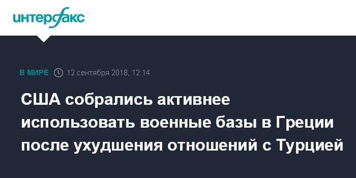 Москва. 12 сентября. INTERFAX.RU - США рассматривает возможность более активного использования военно-морских баз и авиабаз Греции для проведения своих операций в связи с ростом напряженности отношений Вашингтона с Турцией, пишет в среду газета The Wall Street Journal.