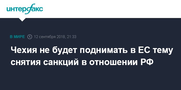 Москва. 12 сентября. INTERFAX.RU - Чехия, несмотря на усилия президента страны Милоша Земана, не намерена поднимать в ЕС вопрос о снятии санкций с России, пишет чешская газета "Млада фронта днес", которая приводит слова главы чешского правительства Андрея Бабиша.