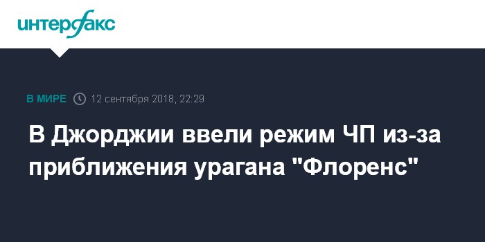 Москва. 12 сентября. INTERFAX.RU - Власти штата Джорджия в США в среду ввели режим чрезвычайного положения в связи с приближением урагана "Флоренс", который приблизился к штатам Северная и Южная Каролины, сообщает в среду информагентство Associated Press.