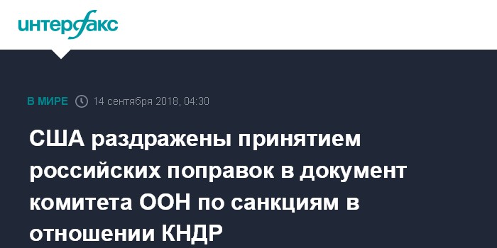 Москва. 14 сентября. INTERFAX.RU - Внесение предложенных Россией поправок в документ Комитета ООН по санкциям против Северной Кореи вызвало раздражение в Соединенных Штатах, сообщают СМИ.