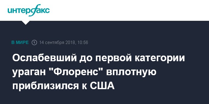 Москва. 14 сентября. INTERFAX.RU - Ураган "Флоренс", который ослаб до первой категории мощности из пяти по шкале Саффира - Симпсона, в течение пятницы ударит по восточному побережью США, сообщает ABC News. Ураган находится в примерно 55 км от прибрежного города Уилмингтон в штате Северная Каролина. При этом скорость ветра снизилась до 135 км/ч.