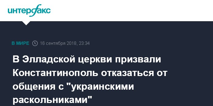 Москва. 16 сентября. INTERFAX.RU - На фоне вмешательства Константинополя в церковные дела Украины в Элладской православной церкви напомнили патриарху Варфоломею о том, что каноны запрещают общаться с представителями раскола.