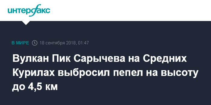 Москва. 18 сентября. INTERFAX.RU - Вулкан Пик Сарычева на о.Матуа (Средние Курилы Сахалинской области) во вторник утром выбросил столб пепла высотой до 4,5 км над уровнем моря, сообщает Камчатская группа реагирования на вулканические извержения (KVERT) Института вулканологии и сейсмологии Дальневосточного отделения Российской академии наук (РАН).