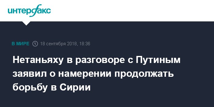 "Нетаньяху поговорил по телефону с Российским президентом Путиным и выразил сожаление в связи с гибелью 15 членов экипажа российского самолета, сбитого возле Сирии", - написал в твиттере журналист этого телеканала Барак Равид.