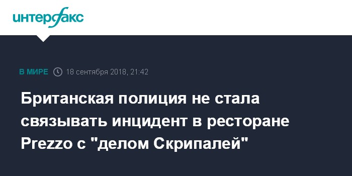 Москва. 18 сентября. INTERFAX.RU - Полиция графства Уилтшир не связывает недавний инцидент в ресторане Prezzo с отравлениями нервно-паралитическим веществом в Солсбери и Эймсбери, а также не считает недавний инцидент подозрительным, говорится в сообщении полиции.