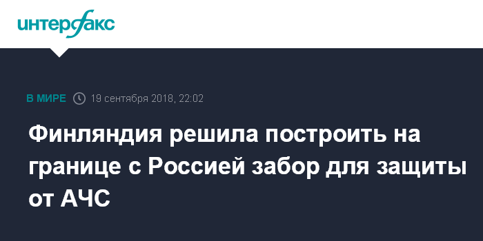 Москва. 19 сентября. INTERFAX.RU - Финляндия намерена построить на границе с Россией забор из стальной сетки для защиты от диких кабанов, которые являются переносчиками вируса африканской чумы свиней (АЧС).