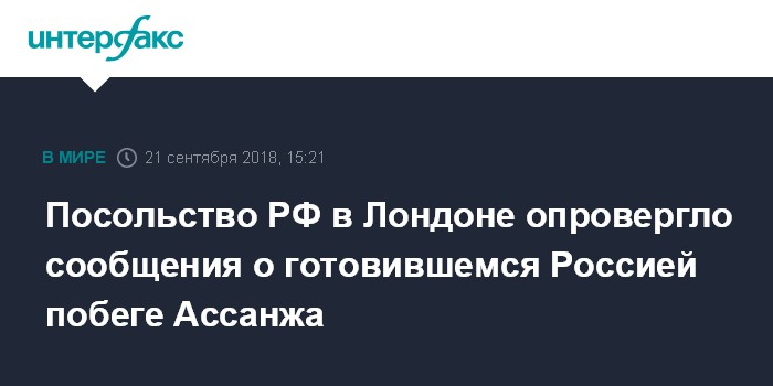 Москва. 21 сентября. INTERFAX.RU - Посольство России в Лондоне опровергло сообщения британской газеты The Guardian о том, что РФ якобы вынашивала секретный план оказания основателю Wikileaks Джулиану Ассанжу помощи в бегстве из Великобритании.