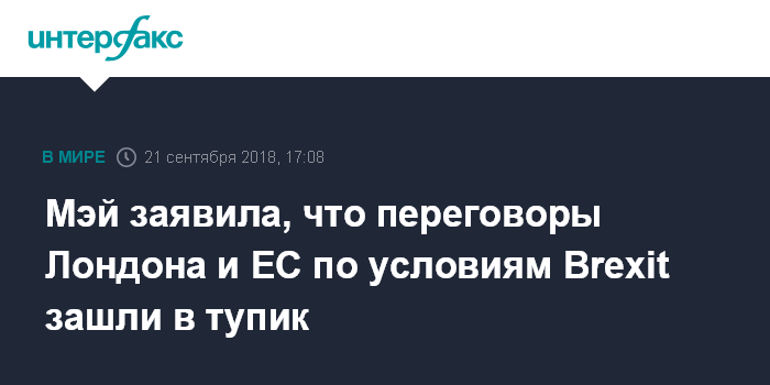 Москва. 21 сентября. INTERFAX.RU - Переговоры Лондона и Брюсселя вокруг условий выхода Великобритании из Европейского Союза зашли в тупик, и прозвучавший в Зальцбурге ответ европейской стороны на предложения Великобритании был неприемлемым, заявила в пятницу британский премьер-министр Тереза Мэй.