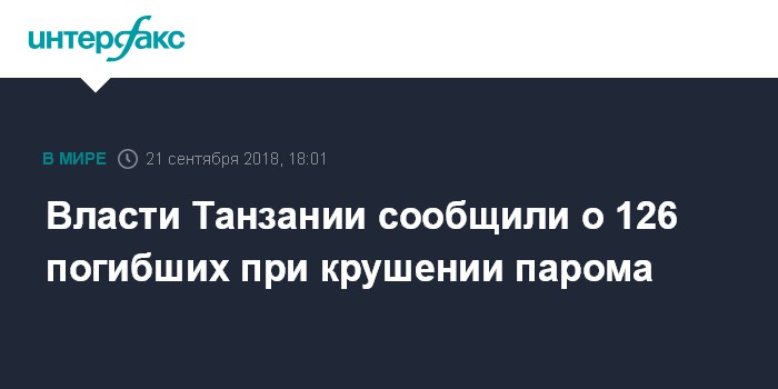 Москва. 21 сентября. INTERFAX.RU - По меньшей мере 126 человек погибли в Танзании после того, как на озере Виктория перевернулся паром, сообщает в пятницу CNN со ссылкой на слова министра транспорта Танзании Исаака Камвельве.