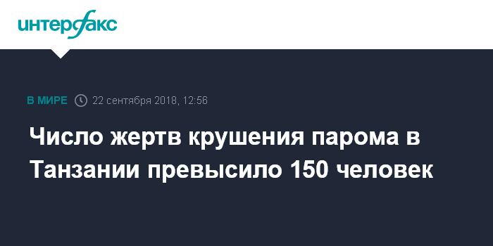 Москва. 22 сентября. INTERFAX.RU - Число погибших в крушении парома на озере Виктория в Танзании достигло 151 человека, сообщают в субботу местные СМИ.