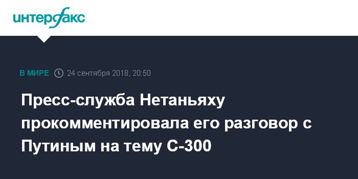 Москва. 24 сентября. INTERFAX.RU - Премьер-министр Израиля Биньямин Нетаньяху в телефонном разговоре с российским президентом Владимиром Путиным заявил, что готовящаяся передача Сирии комплекса С-300 увеличит напряженность в регионе, сообщила в понедельник пресс-служба премьера.