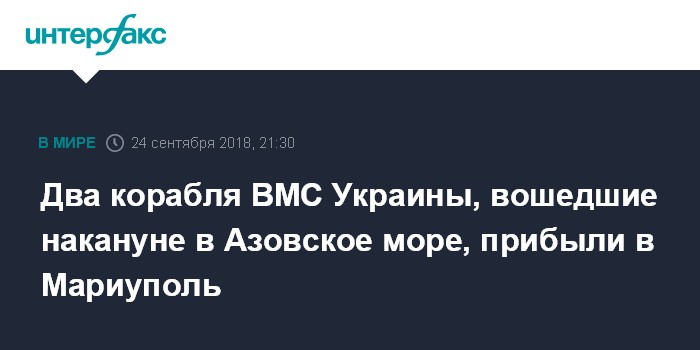 Москва. 24 сентября. INTERFAX.RU - Два корабля ВМС Украины - поисково-спасательное судно "Донбасс" и буксир "Корец", которые в минувшее воскресенье прошли через Керченский пролив, к вечеру понедельника добрались до Мариуполя в Донецкой области Украины, сообщил "Украинский милитаристский портал".