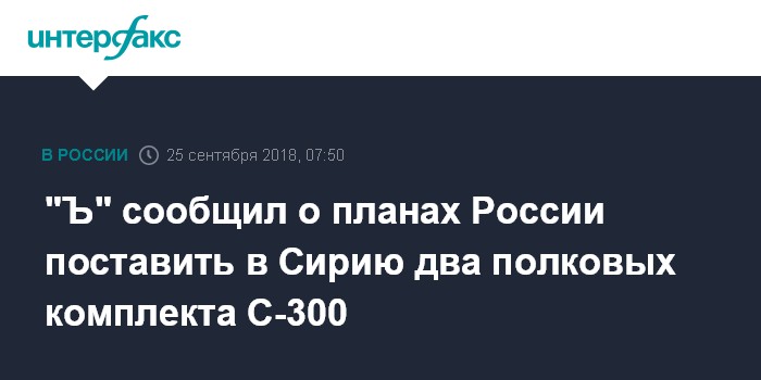 Москва. 25 сентября. INTERFAX.RU - Россия поставит в Сирию два полковых комплекта зенитных ракетных систем С-300, сообщает во вторник газета "Коммерсант", ссылаясь на неофициальные данные.