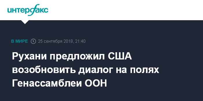 Москва. 25 сентября. INTERFAX.RU - Президент Ирана Хасан Рухани во вторник, выступая на Генассамблее ООН, призвал США начать диалог на "нейтральной территории" Организации объединенных наций.