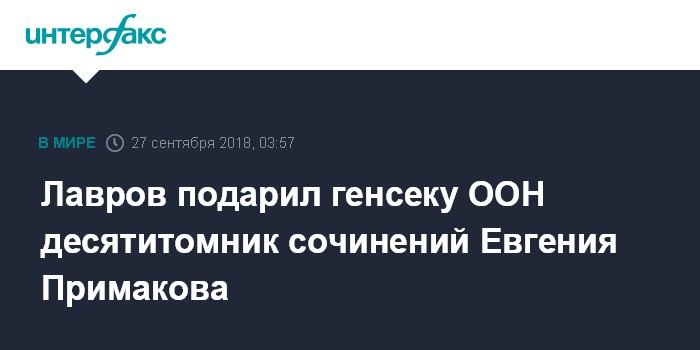 "Я бы хотел подарить вам 10 томов работ Евгения Примакова, который был российским министром иностранных дел, премьер-министром, директором Службы внешней разведки, членом Российской академии наук и одним из моих учителей в министерстве иностранных дел. Я надеюсь, что эти книги найдут свое место в библиотеке ООН", - сказал Лавров.