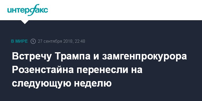 Москва. 27 сентября. INTERFAX.RU - Президент США Дональд Трамп встретится с заместителем генпрокурора Родом Розенстайном на следующей неделе, сообщает в четверг газета The New York Times со ссылкой на Белый дом.